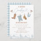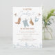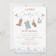 Linda cinza Azul Linha Roupas Lindas Pequeno Chá de fraldas de Vaqueiro Convite chá de fraldas de linha de roupas de vaqueiro convite para um bebê com bota de vaqueiro, chapéu de vaqueiro, cachecol e roupas de bebê. Este pequeno convite para chá de fraldas de cowboy também apresenta uma imagem do deserto ocidental e uma caligrafia moderna que se dirige com coração.