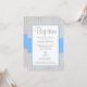 Convites modernos de batismo azul e cinza. Apresentando uma cinza e um padrão de fevron branco e uma cruz azul.
