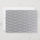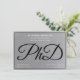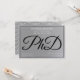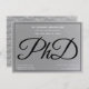 Um convite para a festa de formatura de doutorado em prata-cinza (não-folha), preto e branco. Este convite também tem um padrão da palavra PhD, em script, no verso.