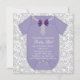 Lavanda roxa adorável com colar de diamante e roxo arco roxo e convites para chás para bebês de cinzas. Este belo convite para chá roxo e cinza damask baby girl é facilmente personalizado para o seu evento, adicionando detalhes do seu evento, estilo de fonte, tamanho e cor da fonte e texto.