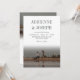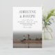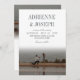 Dois lados em um convite de casamento fotográfico com uma foto do casal feliz de um lado por baixo de um convite informal de casamento com seus nomes em letras grandes. Do outro lado, adicione uma segunda foto junto com seus detalhes de casamento, como acomodação, site, registro e qualquer outra coisa que você precisar. Um convite para casamento de fotos elegante.