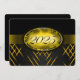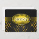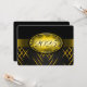 Convite de festa de formatura amarela e preta com listras amarelas claras e escuras e uma fita amarela passando mostrando o ano de graduação. A parte traseira da placa é preta com fonte amarela clara para que as pessoas preencham os convites de festa de formatura.