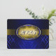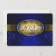 Convite à graduação de azul e ouro com listras azuis claras e escuras e uma fita de ouro passando mostrando o ano de graduação. A parte traseira do cartão é azul com fonte de ouro claro para as pessoas preencherem os anúncios de graduação.