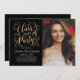 Cartão de anúncio de graduação em dois lados e convite de festas com na moda com um retrato do formando com design de folha de ouro falso elegante em um script com acentuações bonito de rolagem. A frente do cartão também inclui o ouro personalizado e o texto colorido branco que podem ser personalizados para o evento. O verso do cartão anuncia a graduação com uma segunda foto e um texto personalizado para o nome do formando, ano de aula e escola. A cor preta de fundo pode ser modificada. Dica de foto: recorte sua segunda foto em um formato quadrado antes de carregar no site.