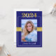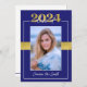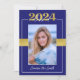 Este convite para a graduação da Classe Azul e Ouro de 2024 pode ser personalizado para convidar para iniciar exercícios e/ou uma festa de formatura em honra do formando. Isso funcionaria bem para formandos masculinos ou femininos. A frente apresenta um retrato do estudante graduado colocado com destaque na 'classe de 2024' acima da fotografia e o nome do formando abaixo. Há também uma fita falsa sobre o meio atrás da foto. O verso contém todas as informações necessárias para comparecer às festividades. Uma linha azul e a "classe de 2024" estão na borda inferior. Este convite funcionaria bem para o segundo grau e graduação universitária.