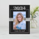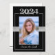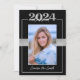Este convite para a graduação da Classe Preta e Prata de 2024 pode ser personalizado para convidar para iniciar exercícios e/ou uma festa de formatura em honra do formando. Isso funcionaria bem para formandos masculinos ou femininos. A frente apresenta um retrato do estudante graduado colocado com destaque na 'classe de 2024' acima da fotografia e o nome do formando abaixo. Há também uma fita falsa sobre o meio atrás da foto. O verso contém todas as informações necessárias para comparecer às festividades. Uma linha preta e a "classe de 2024" estão na borda inferior. Este convite funcionaria bem para o segundo grau e graduação universitária.