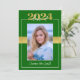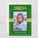 Este convite para a graduação da Classe Verde e Ouro de 2024 pode ser personalizado para convidar para iniciar exercícios e/ou uma festa de formatura em honra do formando. Isso funcionaria bem para formandos masculinos ou femininos. A frente apresenta um retrato do estudante graduado colocado com destaque na 'classe de 2024' acima da fotografia e o nome do formando abaixo. Há também uma fita falsa sobre o meio atrás da foto. O verso contém todas as informações necessárias para comparecer às festividades. Uma linha verde e a "classe de 2024" estão na borda inferior. Este convite funcionaria bem para o segundo grau e graduação universitária.
