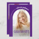 Celebrar as conquistas da Classe 2025 com este convite para na moda e festa de formatura roxa moderna. Apresentando um layout simplista, este convite destaca a palavra "FORMANDO" em tipografia elegante, enfatizando o destaque principal do evento. O centro da atenção é um design de arco que inclui uma foto do formando e, à esquerda, um contemporâneo curvo à direita com o nome do formando exibido de forma destacada, tudo sobre fundo roxo. A parte de trás do convite mostra outra foto e uma mensagem personalizada, fazer-a como uma marca especial para todos os convidados.