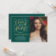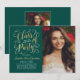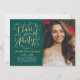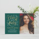 Cartão de anúncio de graduação em dois lados e convite de festas com na moda com um retrato do formando com design de folha de ouro falso elegante em um script com acentuações bonito de rolagem. A frente do cartão também inclui o ouro personalizado e o texto colorido branco que podem ser personalizados para o evento. O verso do cartão anuncia a graduação com uma segunda foto e um texto personalizado para o nome do formando, ano de aula e escola. A cor de fundo verde esmeralda profunda pode ser modificada para coordenar com as cores da foto ou da festa. Dica de foto: recorte sua segunda foto em um formato quadrado antes de carregar no site.