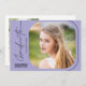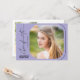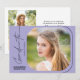 Este convite de festa de formatura de script moderno apresenta texto estilo de escrita manual e uma fotografia quadrada com cantos arredondados sobre fundo roxo claro. A parte de trás oferece uma segunda foto vertical e texto personalizado para que você adicione os detalhes do seu convite de festas.