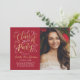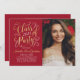Cartão de anúncio de graduação em dois lados e convite de festas com na moda com um retrato do formando com design de folha de ouro falso elegante em um script com acentuações bonito de rolagem. A frente do cartão também inclui o ouro personalizado e o texto colorido branco que podem ser personalizados para o evento. O verso do cartão anuncia a graduação com uma segunda foto e um texto personalizado para o nome do formando, ano de aula e escola. A cor vermelha de fundo profunda pode ser modificada para coordenar com as cores da foto ou da parte. Dica de foto: recorte sua segunda foto em um formato quadrado antes de carregar no site.