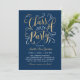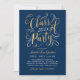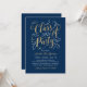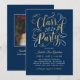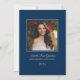 Cartão de anúncio de graduação dupla na moda com dois lados e convite de festas apresenta um design de folha de ouro elegante e elegante com acentos de rolagem bonito. A frente do cartão também inclui o ouro personalizado e o texto colorido branco que podem ser personalizados para o evento. O verso do cartão anuncia a formatura com uma foto do formando, seu nome, ano de aula e escola. A cor azul do marinho pode ser modificada. Dica de foto: recorte sua segunda foto em um formato quadrado antes de carregar no site.