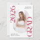 Convide a família e os amigos a celebrarem o formando com estes convites para festas de formatura de na moda! O design de tendência apresenta "Classe de Formando 2025" em letras vermelho em negrito com acentos sutis de script com um fundo branco sólido. A foto vertical do formando é exibida em dentro e oblonga no centro do convite. Personalize a frente do convite à formatura vermelha com o nome do formando e a escola. O convite reverte para exibir seus detalhes de festa de formatura em branco com um fundo vermelho. Este convite para formandos é perfeito para formandos de segundos graus e faculdades.