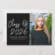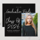 Comemore a conquista do seu formando com estes convites de festa de formatura modernos, que incluem a "Classe 2025" em um roteiro manuscrito branco na moda sobre um fundo preto elegante. Personalize a frente com o nome do formando, o nome da escola e uma foto de mais velho vertical para um toque personalizado. O verso do convite apresenta todos os elementos essenciais do partido, em letras brancas elegantes, sobre um fundo preto correspondente. Perfeito para formandos segundos graus e universitários, esses convites ousados e sofisticados dão o tom para uma celebração memorável de graduação.