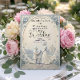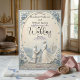Set a sophisticated tone with this dusty blue and cream design, featuring a printed faux bas-relief proposal scene perfect for a springtime celebration.This elegant composition utilizes a formal typographical hierarchy, balancing classic serif fonts in dark navy with flowing calligraphy script. The central illustration showcases a highly detailed, faux 3D sculpted aesthetic depicting a classic garden environment. Visual elements include an off-white and cream background framing a cobblestone path, a traditional pavilion building, and a kneeling groom proposing to a bride in a flowing dress. The perimeter is softened by an oval botanical border of dusty blue blossoms, soft grey-blue greenery, and scattered flower petals.This is a flat printed image with a faux bas-relief effect, not actual raised material.