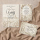 Transport guests to a romantic bygone era with this Regency-inspired engagement design, featuring a faux stone bas-relief effect and soft pastel florals.This design features a sophisticated trompe-l'œil (optical illusion) composition simulating the look of an antique stone carving. The visual center captures a silhouette of a couple in a traditional kneeling proposal pose, framed by an intricate archway of faux sculpted masonry. The "stone" features a warm, neutral cream and beige palette, accented by printed textures of pastel pink roses and sage green climbing vines that appear to grow over the arch. The typography hierarchy balances a bold Gothic blackletter font for the couple's names with a whimsical, flowing calligraphy script for the event details, set against a background of a distant gazebo temple and cobblestone path.