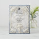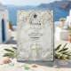 Set a tone of grand elegance for your estate wedding with this design featuring a faux bas-relief Baroque arch, musical angels, and a romantic blue palette.This design features a highly detailed, printed simulation of classical architectural carving. A central archway, rendered in the style of 3D white plaster, frames the text details against a faux dusty blue background. The artwork includes intricate bas-relief effects of blooming white roses, acanthus scrollwork, and two swans at the base. At the top of the column, a cherub angel playing a violin adds a touch of movement. The typography blends an ornate calligraphy script with a traditional serif font in dark charcoal grey for readability.This is a flat printed image with a faux stone texture effect, not actual raised material or embossed paper.