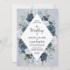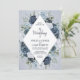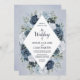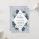 Um convite clássico e elegante mostrando seus detalhes de casamento dentro um elemento diamante branco cercado por flores luxuosas em tons de azul, marinho e branco, tudo em um fundo aquoso e empoeirado azul. O cartão se reverte para um pequeno arranjo floral no centro. Este convite é parte de uma bela suíte de casamento que pode ser totalmente personalizada.