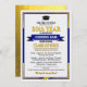 Convites de reunião de excelentes em suas cores azuis e amarelas na escola, que você personaliza com todos os seus detalhes de celebração para seu grande evento de reunião. Este design apresenta um fundo claro com texto mais escuro, sotaques de canto dourado e um boné de formatura e toque que fazem fronteira com os detalhes do evento. O nome da sua escola é destacado em uma faixa de ouro bem no centro.