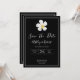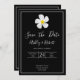 Um simples design moderno com uma flor simbólica, tipo de escrita branca e um contorno branco sobre o preto formal. O fundo tem todos os detalhes do casamento, personalize a frente e volte aos detalhes do seu dia especial. Uma procura clássica por um caso formal. Estilo correspondente no Chá de panela, RSVP, Salvar a Data e muito mais. A flor da Lei Havaiana, Plumeria, é um símbolo de "novos começos".