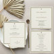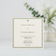 Convite de casamento minimalista em marfim e dourado, apresentando uma refinada moldura dupla em dourado e um design verde com um discreto ícone de palmeira. A frente exibe os detalhes do seu casamento em um layout limpo e atemporal, enquanto o verso exibe suas iniciais personalizadas — adicionando um toque sofisticado e discreto.