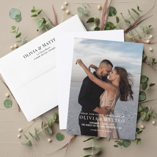 Incômodo na sofisticação do eterno com o nosso convite clássico para casamento de fotos. O convite apresenta uma fotografia pessoal do casal. Itens correspondentes disponíveis.