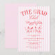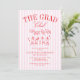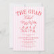 Celebre seu graduado com um estilo moderno e sofisticado com esses convites elegantes de festa de formatura. Com um fundo listrado de rosa e branco, o design apresenta o título ousado “THE GRAD CLUB” (O Clube de Graduados) combinado com uma ilustração divertida de graduados jogando seus chapéus para o alto.