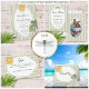 This whimsical coastal wedding invitation features a vintage sun motif, lace border, palm tree, and stylish sage green stripe background. Perfect for a beach or California destination wedding. Created by Simply Farmhouse Press.