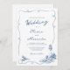 This whimsical hand drawn white and navy blue nautical wedding invitation features a squiggly frame with a lighthouse in the lower right corner.