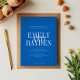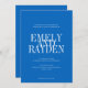 O convite para o casamento apresenta uma design minimalista com um fundo azul de safira e um layout limpo e simétrico. Ele usa fontes de serif elegantes, com os nomes dos casais exibidos de forma proeminente em texto grande, sobreposto para um toque ousado e moderno. Os detalhes restantes são arranjados em uma fonte menor e clara, mantendo simplicidade e sofisticação, combinando estética contemporânea e tradicional.