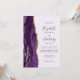 A borda esquerda apresenta uma borda agitada de cor púrpura, aparada com brilho dourado. O texto personalizável combina manuscrito dourado, fontes em copperplate e itálico em um fundo de lavanda pálido. O verso fornece espaço para detalhes do casamento em um fundo de lavanda sólida, junto com um código QR que os convidados podem digitalizar para visitar seu site e RSVP, o que economiza o custo de imprimir e enviar cartões RSVP separados.