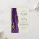 A borda esquerda apresenta uma borda agitada de cor púrpura, aparada com brilho dourado. O texto personalizável combina manuscrito dourado, fontes em copperplate e itálico em um fundo de marfim. O verso fornece espaço para detalhes do casamento em um fundo de marfim sólido, junto com um código QR que os convidados podem digitalizar para visitar seu site e RSVP, o que economiza o custo de imprimir e enviar cartões RSVP separados.