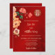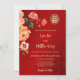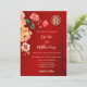Flores de pénia vermelha, laranja e amarela, com fundo de ximersão vermelho. Convite para casamento chinês com um símbolo de felicidade duplo xi ouro. Altere o código qr de trás, adicionando a URL do seu site de casamento.