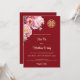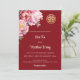 Este elegante convite de casamento chinês mostra peônias de aquarela e um símbolo de dupla felicidade de ouro em um fundo vermelho escuro. Nomes de noiva e noivo em um elegante roteiro escrito à mão. Convite para casamento chinês ou convite para cerimônia de chá. Na parte de trás estão os detalhes e um código qr digitalizável para o seu site de casamento.