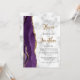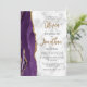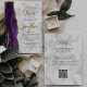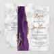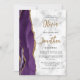 A borda esquerda deste convite de casamento moderno e elegante apresenta uma borda de ágata em aquarela roxa aparada com brilho dourado falso. O texto personalizável combina caligrafia dourada e fontes sans serif pretas em um fundo de mármore cinza e branco. O verso fornece espaço para detalhes do casamento em um fundo de mármore, junto com um código QR que os convidados podem digitalizar para visitar seu site e responder, o que economiza o custo de impressão e envio de cartões de resposta separados.