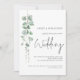 Casamento com Código QR em Elegante Letra de Eucalipto Moderno. Adicione o seu código QR no verso do seu site de casamento torna esta uma opção conveniente para os seus convidados responderem e verem todos os detalhes sem a necessidade de cartões separados de resposta e detalhes. Estilo botânico minimalista, com um conjunto de letra manuscrita para Casamento e o resto do texto que você pode facilmente personalizar. Um ramo elegante de folhas de eucalipto em aquarela desce pelo lado esquerdo.
