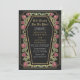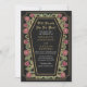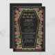 Faça uma declaração ousada de amor eterno. Este convite de casamento gótico apresenta 'Até a morte nos separe' em um quadro em forma de caixão, enfeitado com espinhos, rosas e sotaques dourados contra um fundo preto com seu próprio código QR na parte de trás do convite. Perfeito para uma comemoração romântica assombrosa! Personalize o texto, a fonte e a cor de fundo para se adequar às suas preferências de design. Correspondência de Itens em nosso compro para um tema completo de festa. Note que o ouro do convite NÃO é uma folha real e é impresso em cores planas.