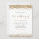 Bordas de Confetes Brilhantes Dourados Roteiro Casamento. Um conjunto de tipografia elegante está em dourado para o título principal O Casamento de complementando o resto do texto que você pode facilmente personalizar, com bordas de confetes brilhantes dourados na parte superior e inferior e também no verso. Adicione seu código QR ao site do seu casamento no verso, o que torna esta uma opção conveniente para que seus convidados respondam e vejam todos os detalhes sem a necessidade de cartões separados de RSVP e detalhes.