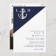 Este convite para casamento elegante, minimalista e náutico azul-marinho e branco pode ser personalizado com suas informações em tipografia moderna e uma foto especial junto com seu endereço de casamento no website do seu endereço QR no verso. Projetado por Thisnotme©