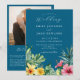 Este convite de casamento de flores tropicais em aquarela azul oceano elegante pode ser personalizado com suas informações em tipografia moderna com o código QR do site do seu casamento no verso ao lado de uma foto especial. Projetado por Thisisnotme©