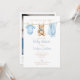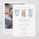 Este convite de chá de bebê fofo apresenta uma linda linha de roupa de bebê menino azul e pode ser personalizado com seus detalhes definidos em tipografia elegante. O verso apresenta sua foto especial e um código QR de registro. Projetado por Thisisnotme©