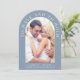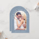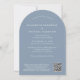 Um convite para casamento moderno e empoeirado em forma de arca azul com sua foto e "Ter e segurar" em uma elegante tipografia serif branca. Sob sua foto, adicione seus nomes, data do casamento e local. No verso, personalize seu convite em uma tipografia branca simples e insira seu endereço no site do casamento para criar um código QR para seus convidados digitalizarem para RSVP on-line e obter detalhes adicionais de casamento, como acomodações.