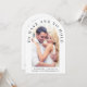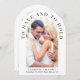 Convite de casamento em forma de arco moderno com sua foto e "Ter e segurar" em tipografia elegante de serifa. Sob sua foto, adicione seus nomes, data do casamento e local. No verso, personalize seu convite em uma simples tipografia e insira seu endereço no site do casamento para criar um código QR para seus convidados digitalizarem para RSVP on-line e obter detalhes adicionais de casamento, como acomodações.