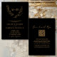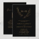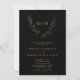 Convite de Casamento com Monograma Botânico Elegante e Coroa de Louro Código QR RSVP Dourado e Preto... A frente do nosso convite de casamento com monograma apresenta uma coroa de louro botânica frondosa exibindo as iniciais da noiva e do noivo acima do texto personalizado do convite em tipografia serifada e sans serif dourada sobre um fundo preto elegante. A parte de trás do convite exibe o código QR do site do seu casamento, bem como a URL do site em si, permitindo que seus convidados respondam facilmente online e visualizem todos os detalhes normalmente enviados em um envelope de casamento. O código QR de exemplo e todo o texto de exemplo (além dos elementos de caligrafia) podem ser facilmente revisados com suas próprias informações no modelo de personalização.