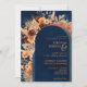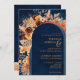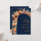 Incrível, moderno convite de casamento com código QR, que inclui boho pampas, elementos florais em terracota, matizes de outono com arco, contra um fundo azul-marinho. Adicione o URL do seu site de casamento no verso do cartão e o código QR será atualizado ou apagado se não for necessário. Clique em personalizar/personalizar ainda mais para incluir seus próprios detalhes.
