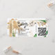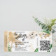 Convocação de casamento Dourada de avião com RSVP, coração e ícone de avião com folhas tropicais. Adicionar seu código QR