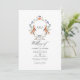 Convite de casamento com um brasão temático de floresta caprichosa personalizável com as iniciais do casal. O código QR no verso direciona para o site do seu casamento onde as pessoas podem saber mais e responder.