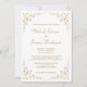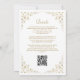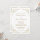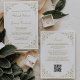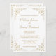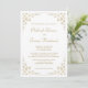 Este elegante convite de casamento formal inspirado na vintage apresenta o texto em um roteiro de cor dourada e fontes serif, enquadrado por um delicado motif de ouro vintage. O verso oferece espaço para detalhes do casamento, juntamente com um código QR que os convidados podem digitalizar para visitar seu site e RSVP, o que economiza o custo de impressão e envio de cartões RSVP separados.