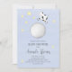 Esta design apresenta um guião capricho bonitinho e neutro em termos de gênero, com o URL da loja de códigos QR, com o website do registro de presentes, com uma vaca a saltar sobre o tema da lua, um guião elegante para a caligrafia, com o convite para o chá de fraldas da moda, e um céu azul e estrelas amarelas lua, ritmo tradicional clássico do berçário, um modelo de cartão-postal amigável em termos orçamentais, para a mãe, mãe mamãe
