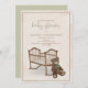 Este design apresenta um convite clássico de vintage, com uma imagem clássica, com um ursinho de pelúcia rústico, verde, com um site de loja online com código QR para a página do evento do Facebook social media URL, um ursinho de bicho de pelúcia, uma tipografia elegante com script de caligrafia, um convite clássico clássico de tendências, um pacote de berços de berços de vintagem, um rabisco castanho de castanho ige, um antigo estilo simples e minimalista, para um convite de chá de fraldas neutro em termos de gênero, para um trabalho de arte desenhado à mão por um rapaz ou uma rapariga por Laura Lacina.